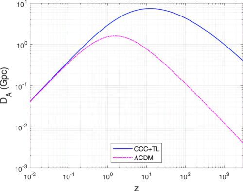 Angular diameter distance versus redshift in two models of the universe. Credit: The Astrophysical Journal (2024). doi: 10.3847/1538-4357/ad1bc6
