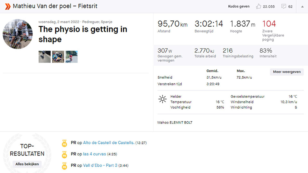 Dirk De Wolf, like many others, closely monitors Mathieu van der Poel’s Strava activity. “Today he traveled 95 kilometers for three hours,” he said. “1.837 altimeter, average power 253, max. 1100 watts. It’s still pulsing at 184 and its intensity in this workout was 83 percent. This is a serious workout. So you’re good, or he’ll be fine.”